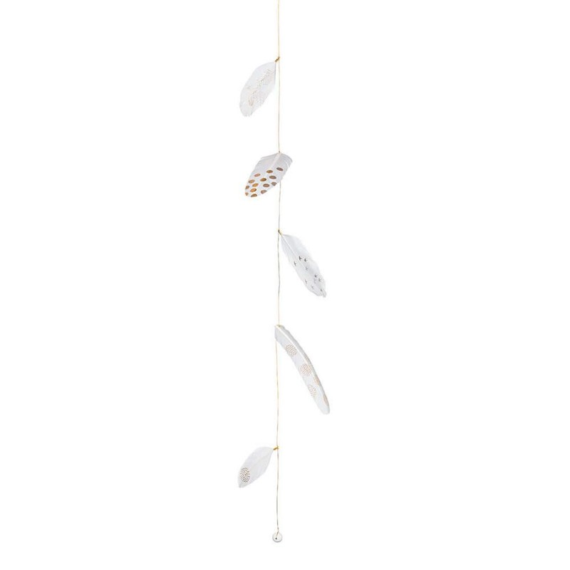 Lightly swinging chain with white feathers, gold printed, hung on a golden steel cable and finished with a porcelain ball final weight.