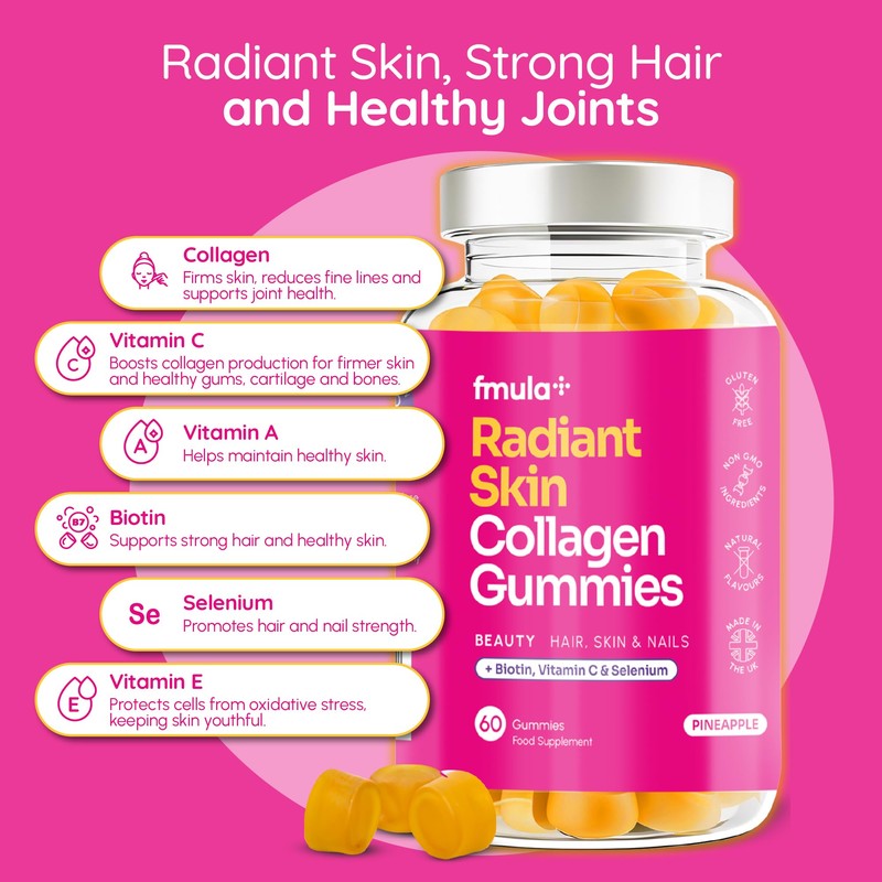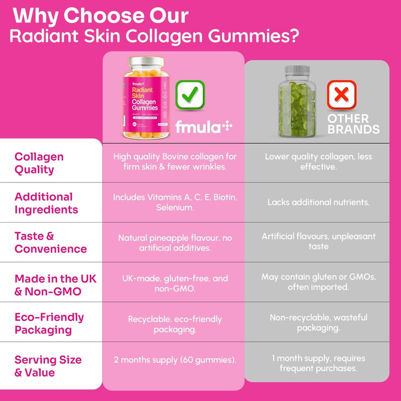 - ✅ NATURAL INGREDIENTS, REAL RESULTS: Feel good about what you’re putting in your body with our biotin and collagen gummies. Each bottle of our fmula+ gummies contains 60 gummies (2 months supply). Free from artificial colours or flavours, gluten, dairy, soy and non GMO ingredients, our collagen chews for women are the perfect collagen supplement to support healthier looking skin.