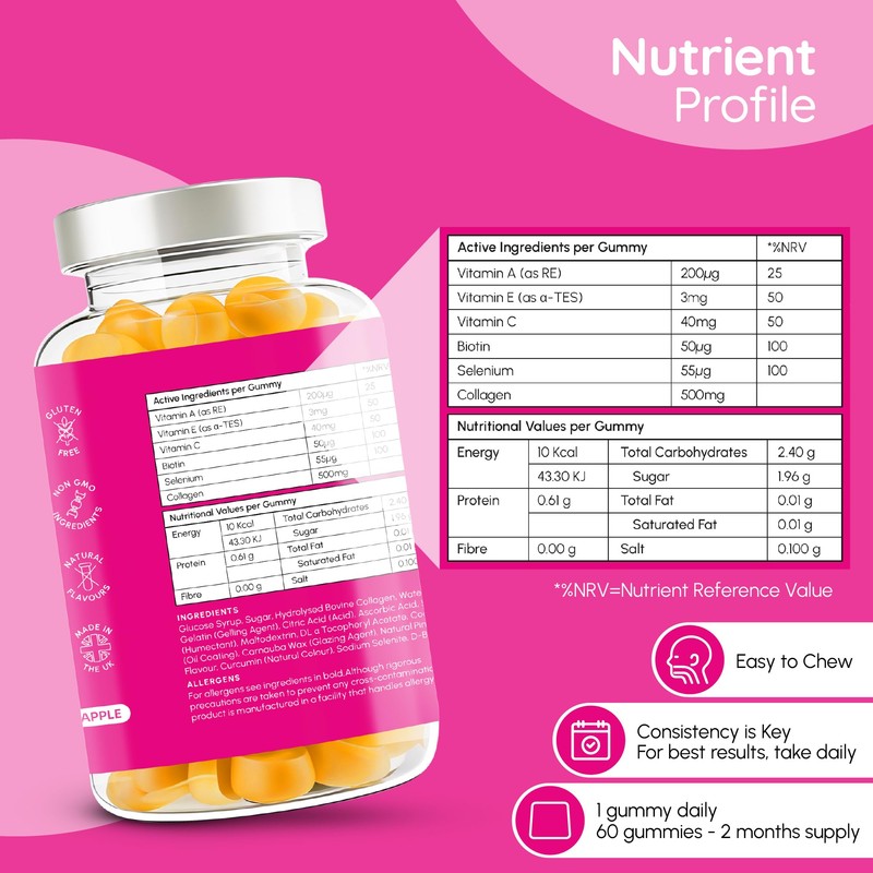 - ✅ INGREDIENTS THAT ENHANCE BEAUTY & JOINT HEALTH: Our collagen peptide gummies are a blend of skin-loving and joint-supporting nutrients. Hydrolysed collagen peptides enhance skin elasticity and joint flexibility, while Vitamin A keeps your skin smooth and clear. Vitamin C boosts collagen production for firmer, more youthful skin, and Biotin helps maintain normal skin and hair. Vitamin E protects against damage, and Selenium strengthens both hair and nails. With these powerhouse ingredients, our biotin and collagen gummies help you look and feel your best every day!