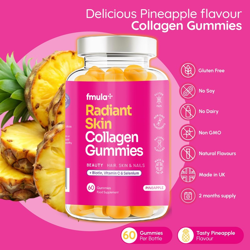 Elevate your beauty and wellness routine with fmula+ Collagen Gummies. These delicious pineapple flavoured collagen peptide gummies are packed with 500mg of hydrolysed collagen per gummy, promoting healthy skin, hair, nails and joint health. Infused with vitamins such as A, C, E and Biotin, our collagen gummies provide support for your body's natural regeneration processes. Free from gluten, dairy, soy and artificial colours, our non-GMO collagen for skin are a pure, safe and effective choice. One collagen gummy a day provides a 2 month supply, making it easy and convenient to integrate collagen into your daily routine. Boost your joint health and maintain flexibility with a powerful blend of nutrients designed to support an active lifestyle and overall wellness.