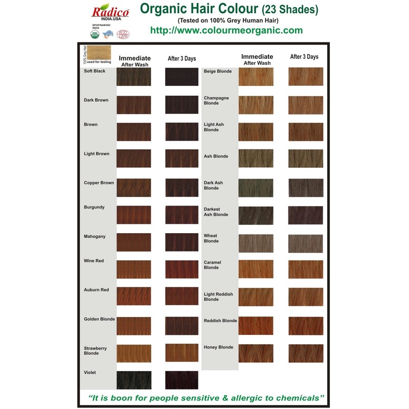 - Radico Colour Me Organic is 100% natural thus the colour outcome may not appear as intensively as when hair is coloured using conventional hair dyes.