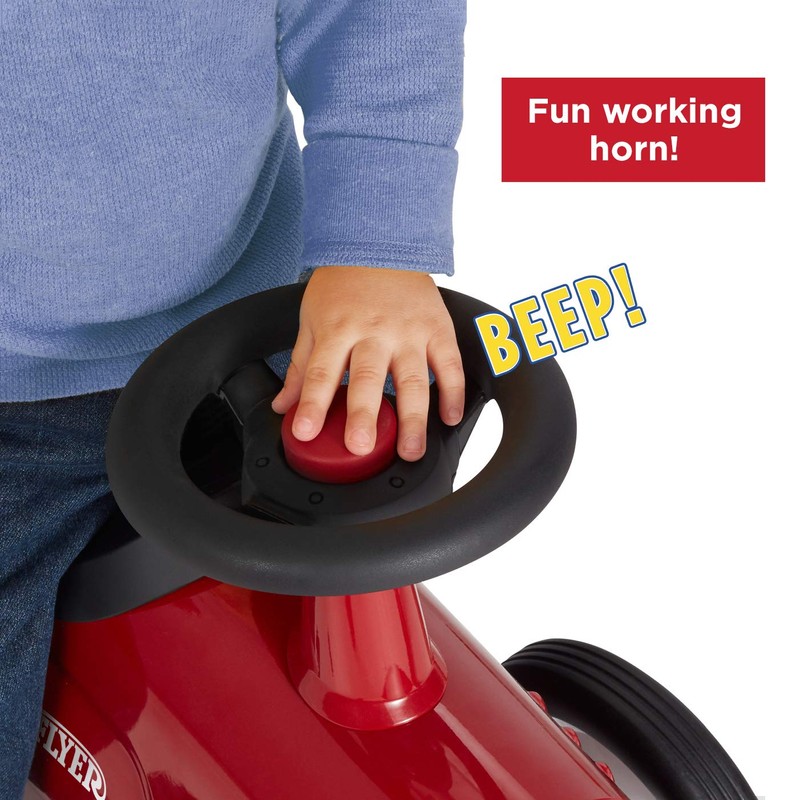 - CLASSIC DESIGN: the Little Red Roadster’s classic design includes a sturdy steel body, chrome finishes, working steering and honking horn. This dependable ride-on will last for years.