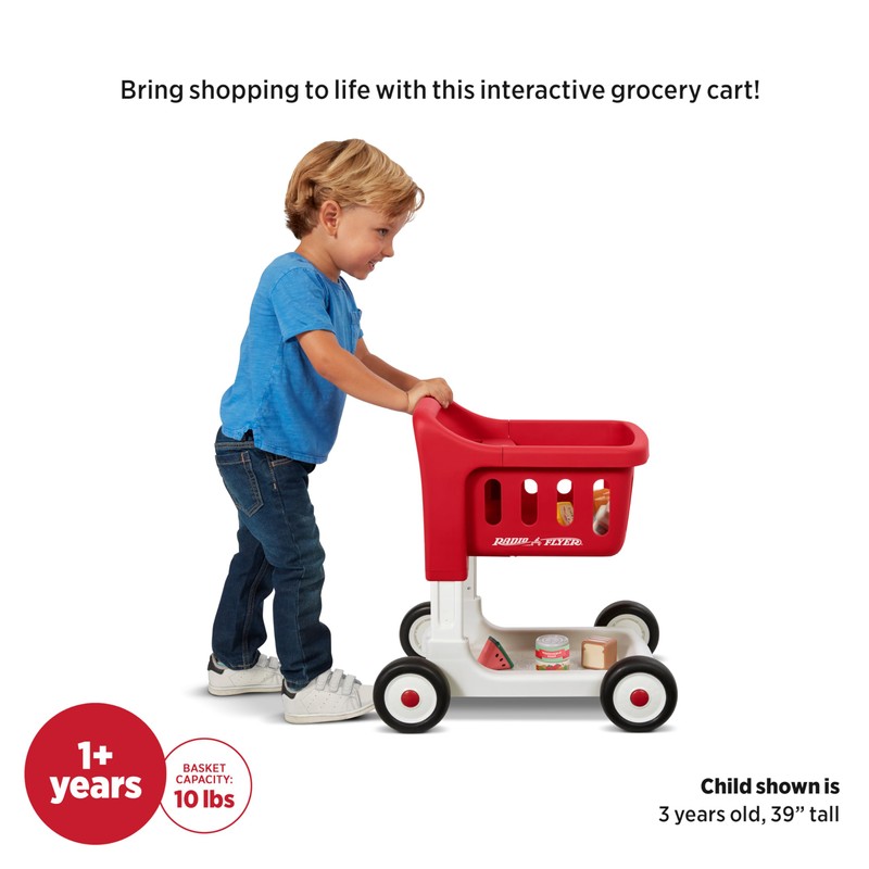 - TOY STORAGE: The 6 included play food items and any other toys can be stored in the basket of the grocery cart. Your toddler can store their favorite toys for imaginative play or bring them on walking adventures. The shopping cart basket can hold up to 10 pounds.