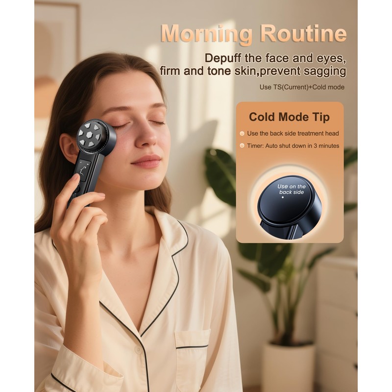 - Smart Skincare System: Heat Opens, Cold Locks, RF Rebuilds, Current-contours. Morning Routine: Cooling Mode - Ice-roller effect to depuff eyes/chin. Current-sculpts jawline/neck-contour, Vibration - Stimulate-microcirculation before makeup. Night Routine: IAP mode: RF+Current technology - Nightly "collagen remodeling" during sleep. Heating Mode - promotes absorption of serums 3X deeper than hands. You can use Vibration mode at the same time with other mode to enhance the results