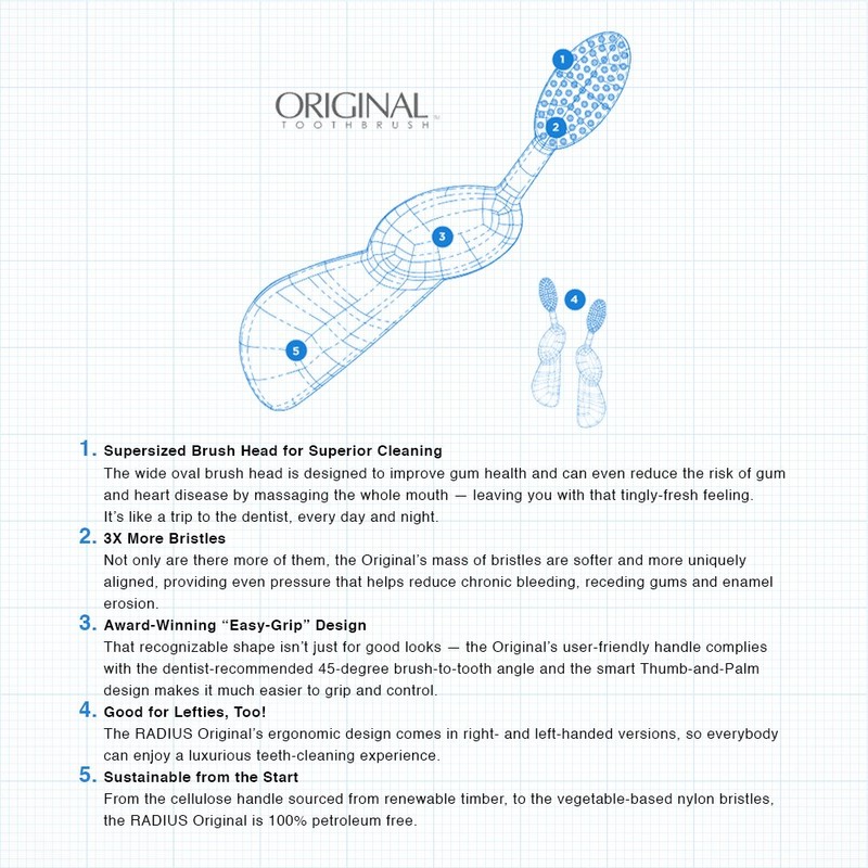 - GOOD FOR RIGHTIES AND LEFTIES: The RADIUS Original’s ergonomic design comes in right- and left-handed versions, so everybody can enjoy a luxurious teeth-cleaning experience.