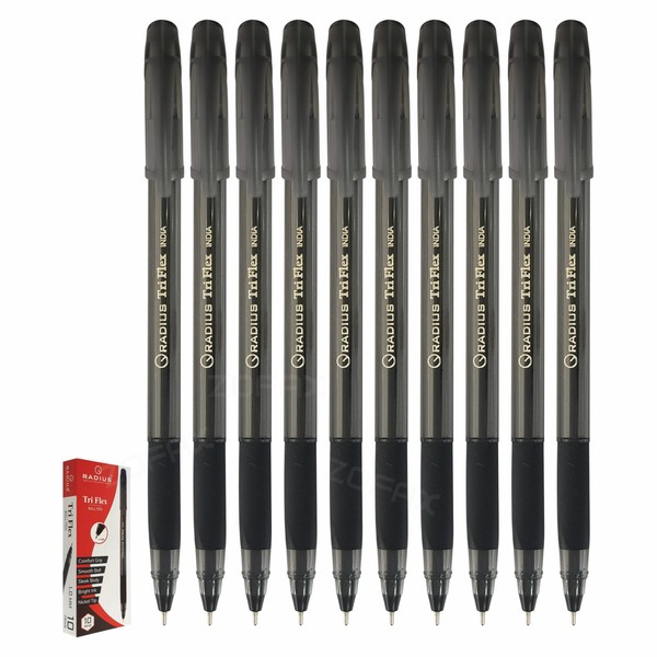 RADIUS Tri Flex Ballpoint Pens, BLACK, 1.0mm Medium Point, Pack of 10, Triangular Comfort Grip, Smooth Ball Pens, Ideal for School Office Home Everyday Use