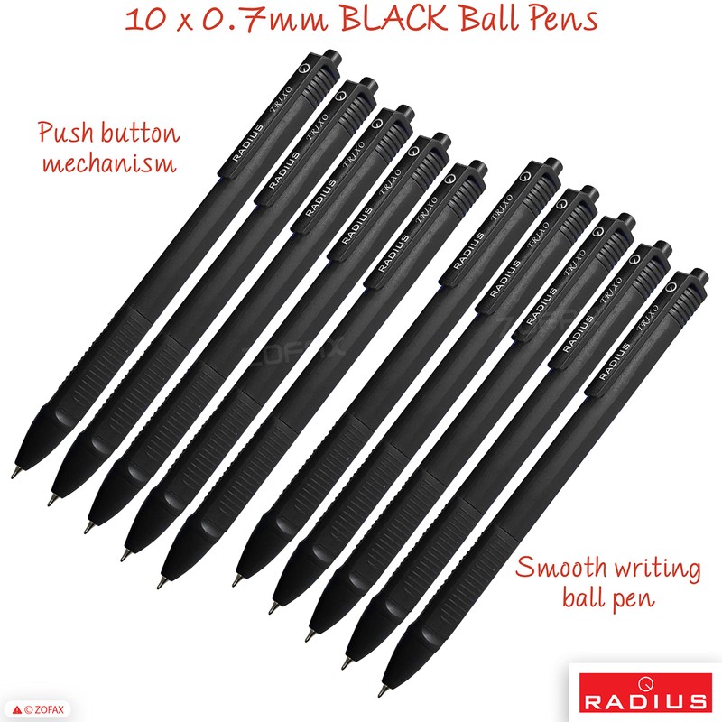 RADIUS Trixo Retractable Ballpoint Pens, BLACK, Fine Point (0.7mm), Pack of 10, Triangular Grip, Smooth Ball Pens, School Office Home Hospital Doctor Nurse Use