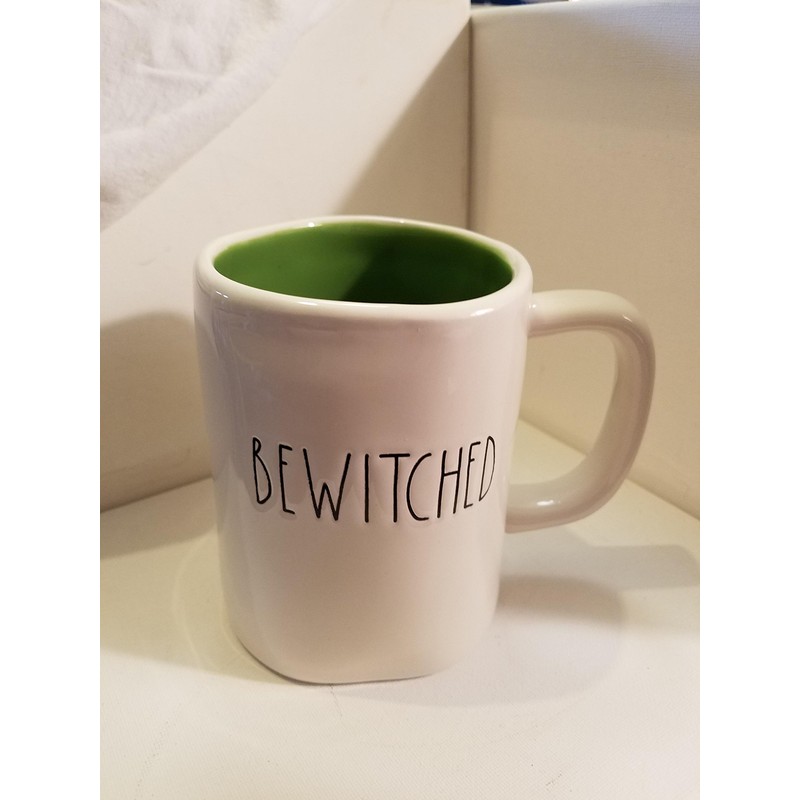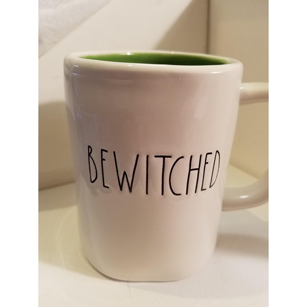 White ceramic mug Bewitched in black lettering with green inside. measures 4.75 inches tall and 3.5 inches wide.
