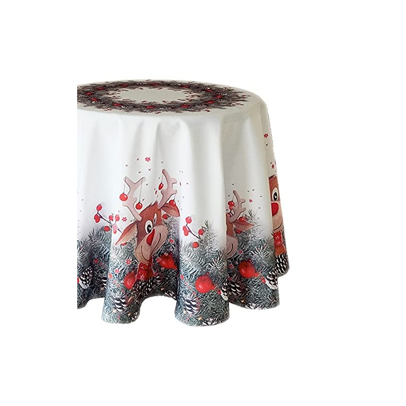 Raebel Christmas Tablecloth, Round, 150 cm, Elk with Red Nose, Underblanket, Christmas Blanket, Christmas Decoration, 100% Polyester, Colourful