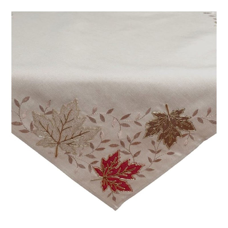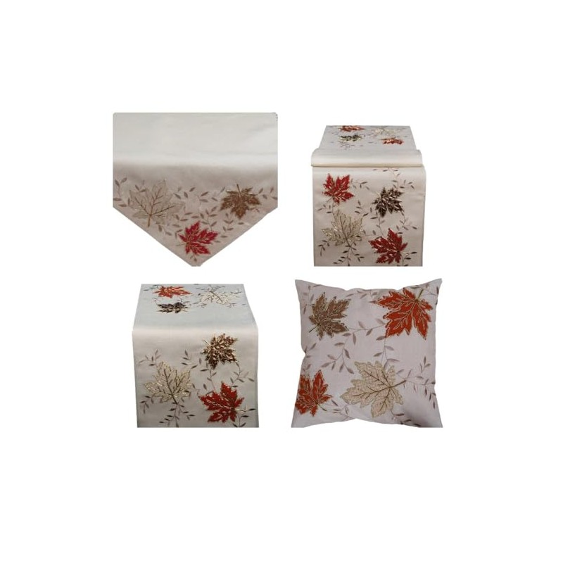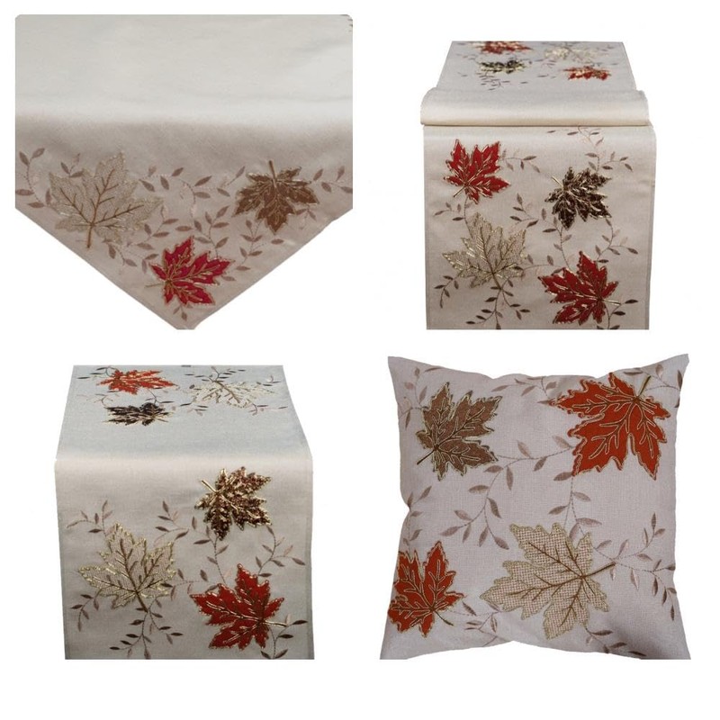 - Fabric made from 100% polyester in easy-care quality. The edge is neatly hemmed. Decorated with leaves in light brown, brown and red as embroidery and appliqué (sewn-on motifs in different fabric quality) edged with golden threads. An elegant looking decoration for autumn and winter.