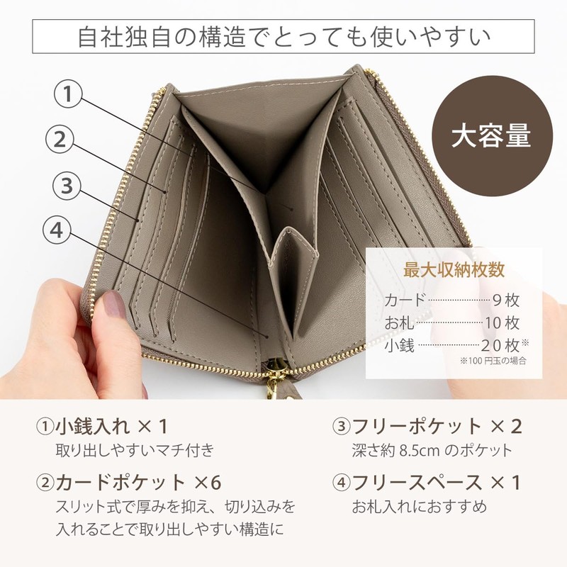 - Smooth checkout: The L-shaped zipper opens to allow access to all your cards, coins, and bills. A coin purse that opens widely, with a wide range of card pockets. Bills can be stored under the coin purse without folding them, or you can divide them from left to right with a bi-fold