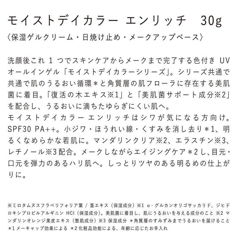 Moist Day Color Enrich is for those who are concerned about wrinkles. SPF30 PA++ 1 x Removes small wrinkles, foul lines, and dullness for bright, smooth and young skin. Mandarin Clear *2, Elastine *3, Retinol *3. 2 Aging care while making up, giving your eyes and mouth an elastic and firm skin. Gives a bright and moist finish.