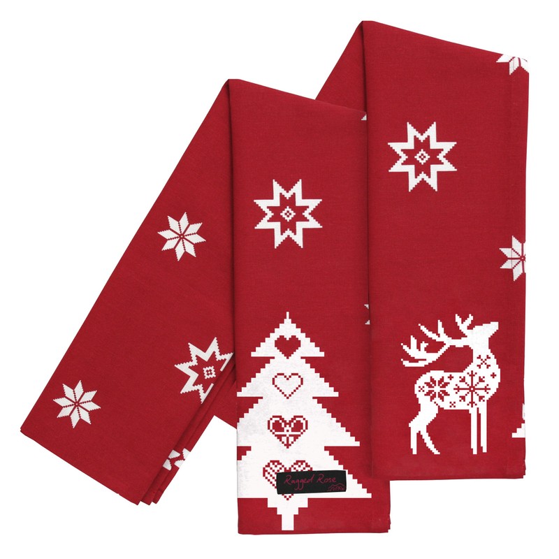 Ragged Rose Christmas Nordic Tea Towels, Cotton, Red, 50 x 70 cms