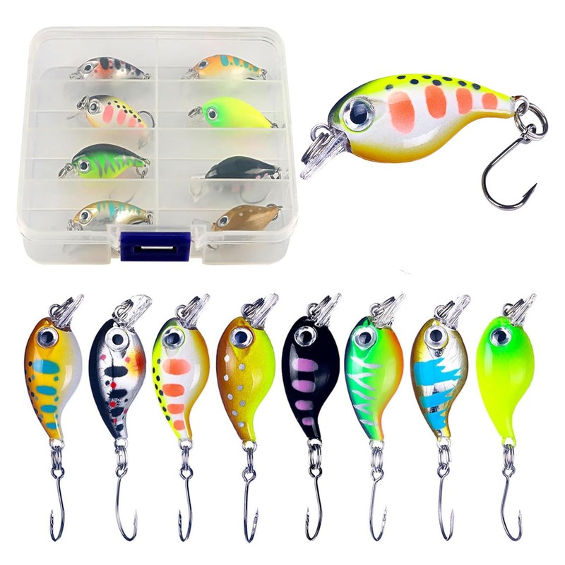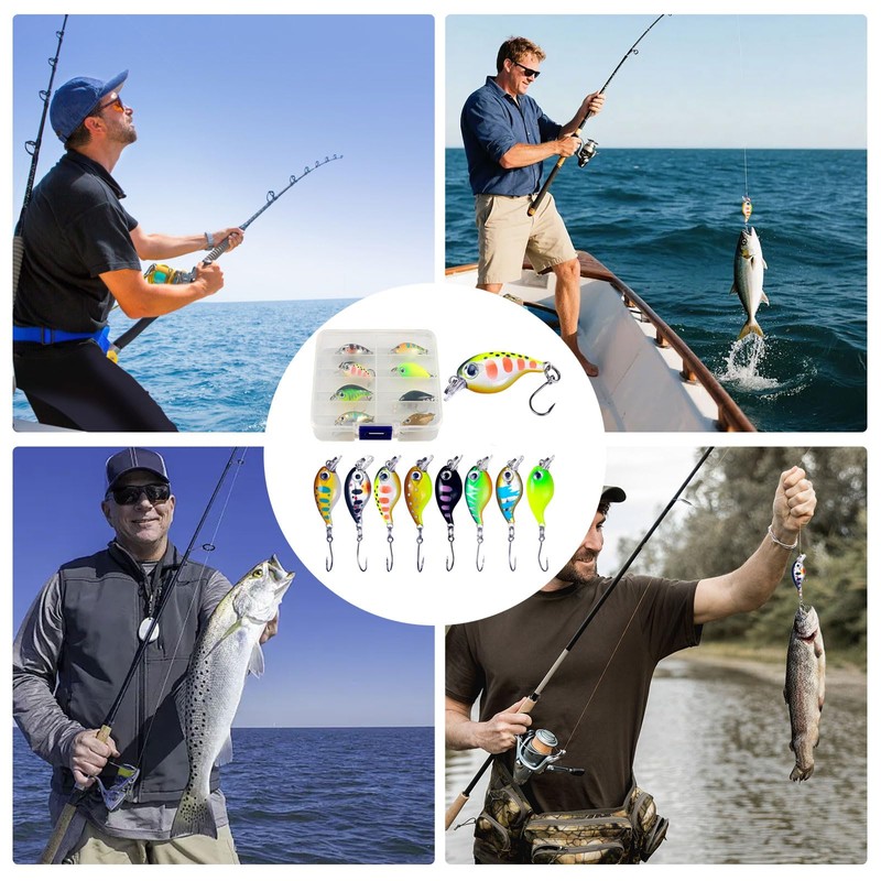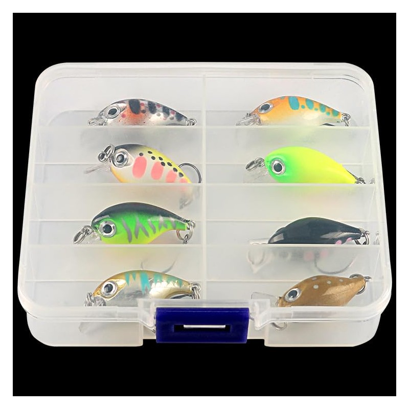 - 6Pcs Fishing Lures Kit : Each Weight: 4g/0.14oz; Each Length: 4.5cm/ 1.77inch,buoyancy:floating crankbait. 8 different colors of fishing crankbait lures come in a plastic tackle box ,Will not paint or fade;Suitable for freshwater fishing and seawater fishing, fish less than 5 kg.