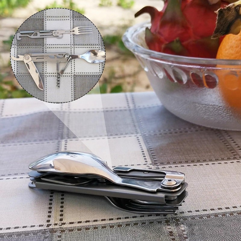 - 6-in-1 stainless steel outdoor cutlery for any adventure - Our camping cutlery offers a unique 5-in-1 combination that includes knife, fork, spoon, corkscrew, bottle opener and can opener. Ideal for camping, hiking and other outdoor activities.
