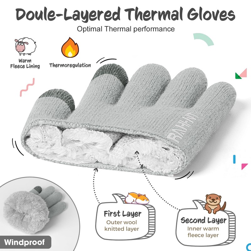 Rahhint Wool Kids Gloves for Boys Girls Winter Thermal Double Knit Gloves with Insulated Fleece Lined Keep Hand Warm Children Toddler Gift 3-15 Years