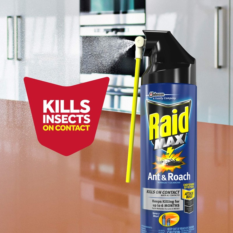 - Raid Max Ant and Roach Spray kills bugs on contact and keeps killing with residual action for up to 6 months