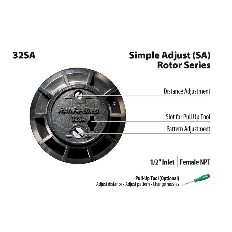 Rain Bird 32SASP Simple Adjust Hose-End Gear Drive Rotor on Small Spike, 40° to 360° Pattern, 19' to 32' Spray Distance. Ideal for medium-size lawn, shrub, and garden areas, the adjustable Rain Bird 32SASP rotor provides uniform coverage on par with automatic sprinkler systems, now offered on a metal spike for use with a garden hose. It features the same proven gear drive and Rain Curtain™ nozzle technology used in underground Rain Bird rotors, producing larger water droplets that avoid wind blown overspray and assure uniform coverage. Quick check arc/fast forward feature allows you to check or set arc while sprinkler is running. Easily adjusts at the top with a flat blade screwdriver from 40° to 360° part-circle arc rotation, and reversing full- circle rotation to ensure you're watering only things that grow, not the house, sidewalk, or driveway. For installation convenience arc rotation is factory preset at 180°. Rain Bird's patented industry-leading Rain Curtain™ nozzle technology delivers a uniform, rotating curtain of large water droplets that fall exactly where you want and resist windblown overspray. The nozzle's "micro ramps" also direct a portion of the spray close to the head, eliminating dry brown spots common with other rotor brands. O-rings and seals for extra protection in “gritty” water; and a self-adjusting stator that doesn't require replacement when changing nozzles. Other quality advances include simple screwdriver adjustments at the top for arc and spray distance. Place it anywhere you would use lawn sprinklers and get beautiful, greener results. The rotor offers an adjustable rotation range from 40° to 360° part- circle and reversing full-circle and sprays at a distance of 19' to 32'. For installation convenience arc rotation is factory preset at 180°. Nozzle is easily removable and additional nozzles are available sold separately (Model# 32SANZLPK). Rain Bird "The Intelligent Use of Water"