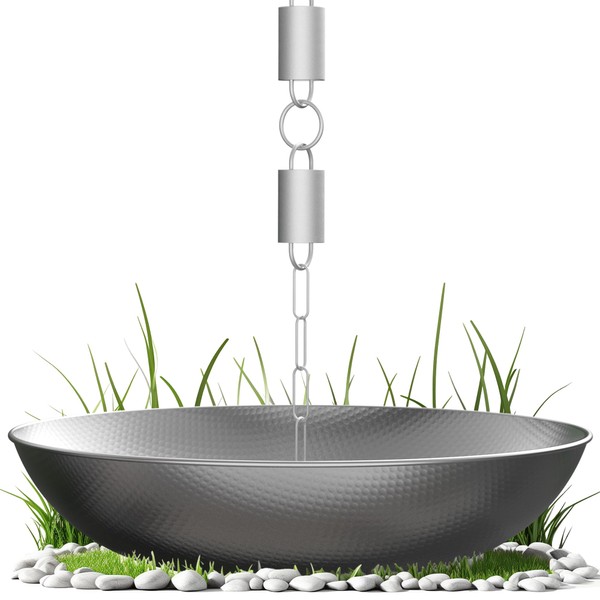Rain chains, sometimes called “gutter chains” or “downspout chains”, are a functional yet beautiful replacement for traditional gutter downspouts. Unlike traditional gutter downspouts, which are often placed out of sight because they are not attractive, rain chains can be prominently placed, enhancing the overall look and curb appeal of the home. Our rain chain basin in aluminum with a hammered pattern is an excellent addition to a rain chain installation. It takes no tools to install and enhances the look of a rain chain. DIAMETER: 16"; HEIGHT: 3.5"
