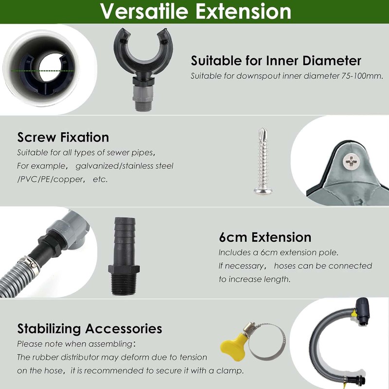 VERSATILE EXPANSION Our rainwater collector is suitable for downpipes from 70-110mm (can be cut according to your needs), and roofs up to 80 sq ft. You can connect other hoses as needed to meet your watering needs.
