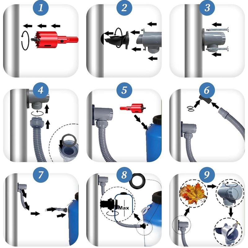 Quick and easy to install: 1. Use the included 25mm hole saw, choose the tank position for drilling; 2. Insert the hose adapter with seal; 3. Connect the hose and water butt connector. Install in 5 minutes!