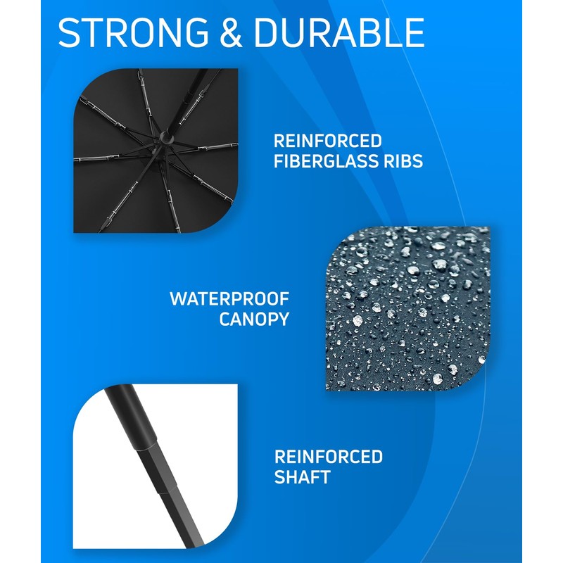- Windproof Travel Stick Umbrella: Our compact umbrella is built to withstand the worst Mother Nature has in store. It features reinforced fiberglass ribs, a sturdy all metal shaft and frame for rigidity in high gust situations