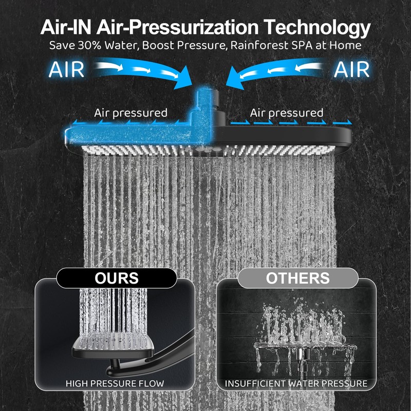 - 12 Inch Rainfall Square Head & Self-Cleaning Nozzles Immerse in pure luxury! The large 12 inch square rain shower head delivers a full-body rainfall sensation. Enjoy complete coverage and relaxing rain shower head showers with easy-clean nozzles that resist clogging.