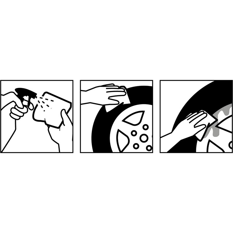 - Spray on a clean, dry tyre; repeat application until desired shine is achieved; wipe excess liquid off rims or painted surfaces