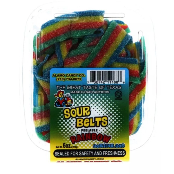 Alamo candy rainbow sour belts are available in 6 ounce packing. Charge your taste buds and get ready to taste the best candy coming out of Texas by one of the largest distributor of candy here in San Antonio. We have created a assortment of the most sought after and bestselling Alamo candy products and made it in one unique bundle for everyone to enjoy. So get ready to taste some of the most tasty dulces mexicanos snacks.