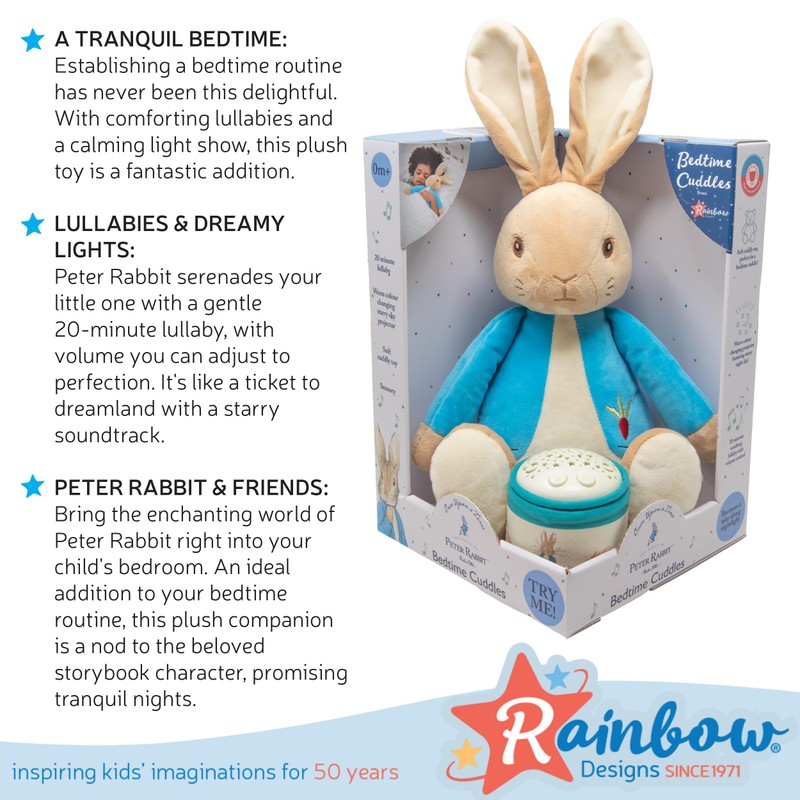 Rainbow Designs Bedtime Cuddles with Peter Rabbit - Classic Character Soft Toy with Starry Night Sky Projecting Nightlight Lantern & Lullaby Sounds