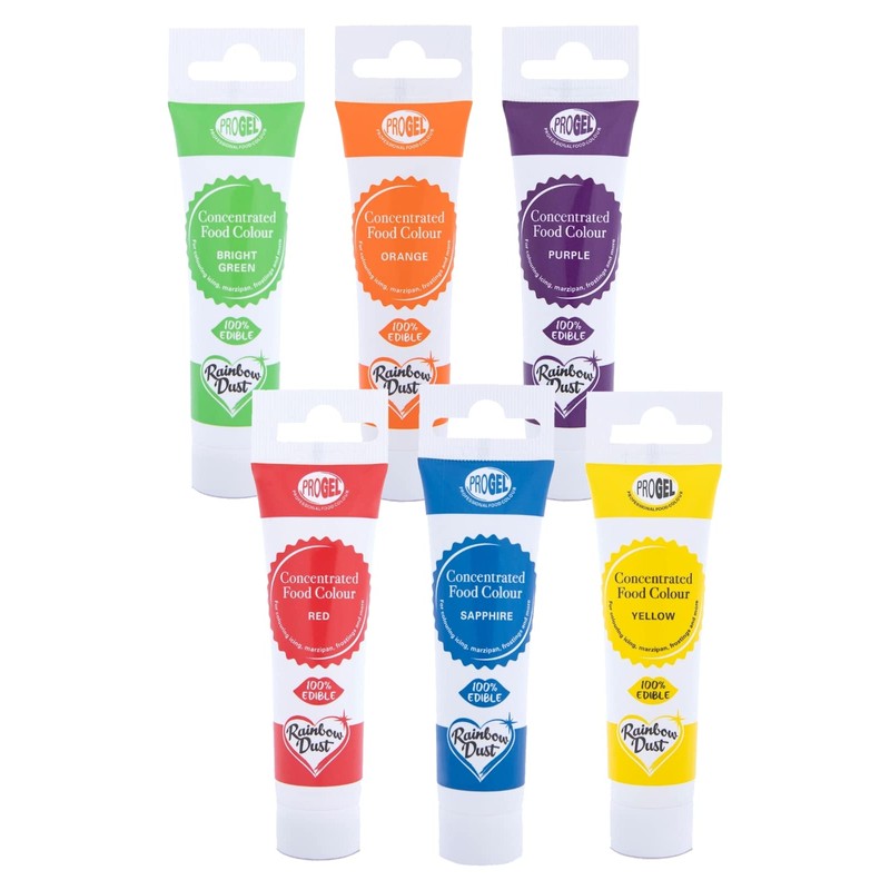 • Rainbow Dust ProGel Rainbow Colours Multipack contains 6 food colouring tubes; Red, Orange Yellow, Bright Green, Sapphire (previously Baby Blue) and Purple.