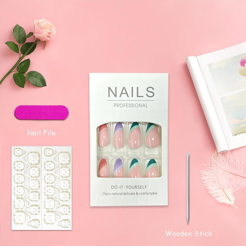 24pcs Multicolor French Tip Press on Nails Long Almond Shape False Nails Set for Women Nail Art Decoration