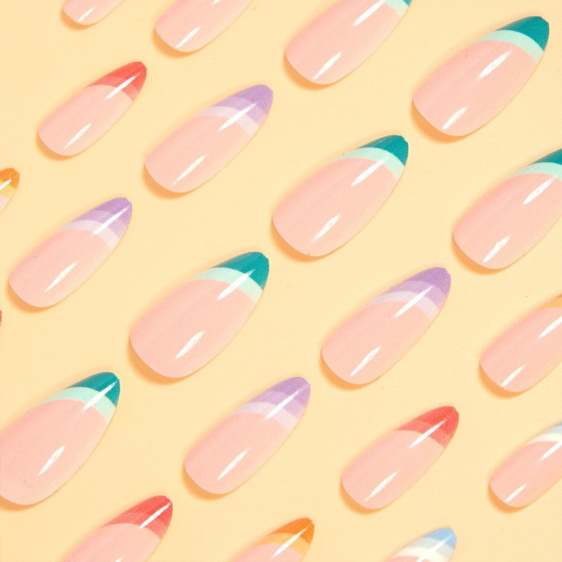 Rainbow French Tip Press on Nails Long Almond Natural Glue on Nail Colorful French Tip False Nails Glossy Reusable Artificial Stick on Nail for Women