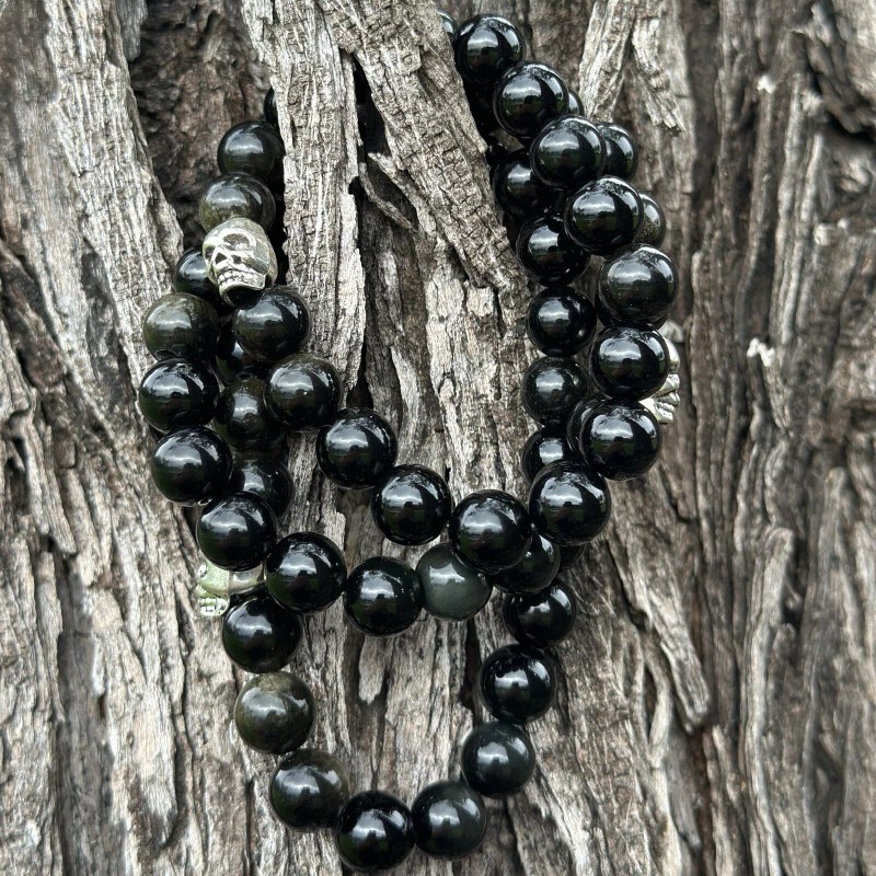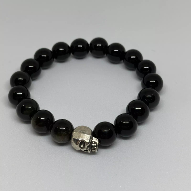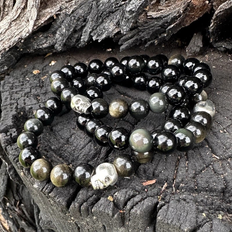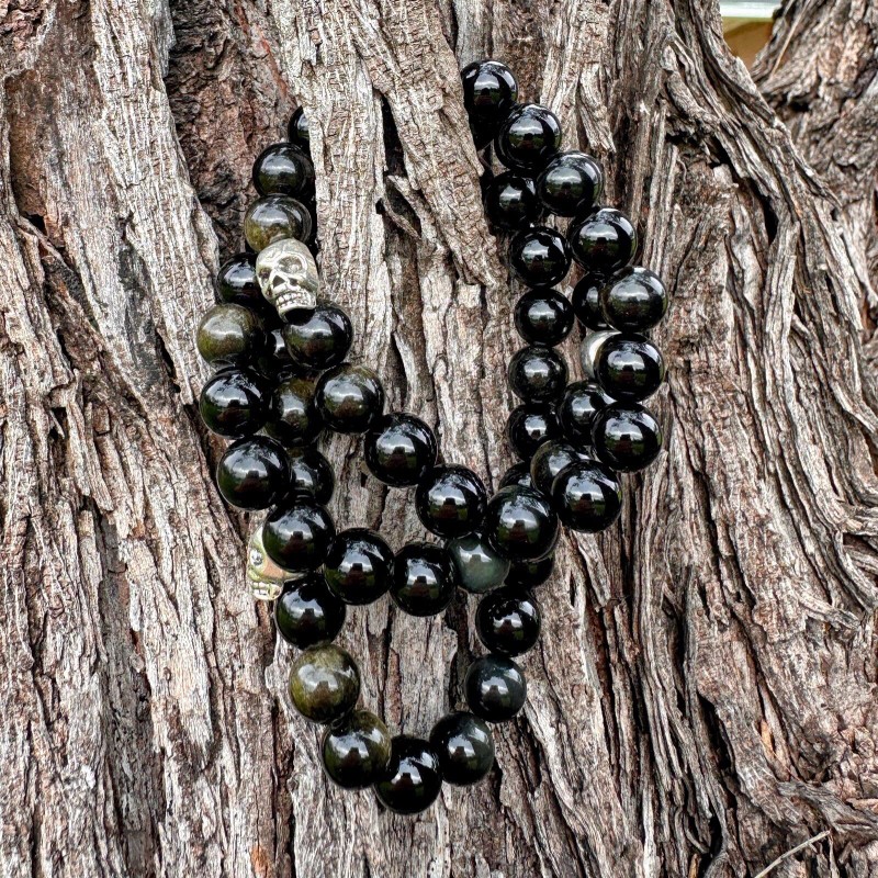 Rainbow Mictlan Tetl Rainbow Golden Obsidian Gemstone Bracelet 10mm Skull. 8, 7, 6 Inch