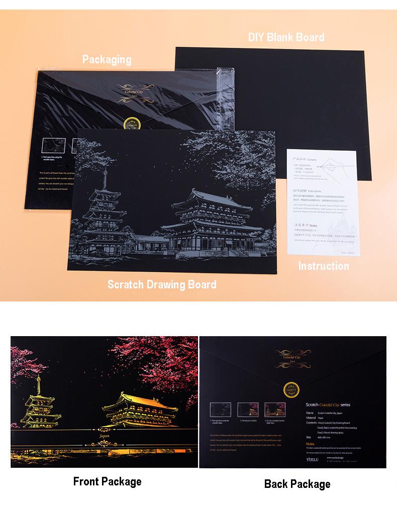 ● 【2. City Night Scene Scratch Rainbow Art Paper vs Traditional Black Scratch Paper Art Set】- Use the scratch tool to scratch off the gray sketch on the scratch rainbow art paper to reveal a real and beautiful city night scene pattern. When finished, it will become a beautiful decoration. It is more collectible than the traditional black scratch paper art set.