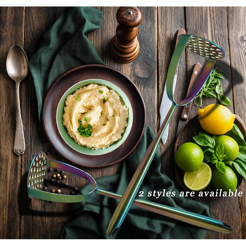 - Space-Smart Style:Gold or vibrant rainbow finishes elevate any kitchen. The integrated hook (wall storage) saves 83% drawer space vs bulky potato ricers. Compact enough for RVs – pair with stainless steel utensils as a complete food masher tool set.