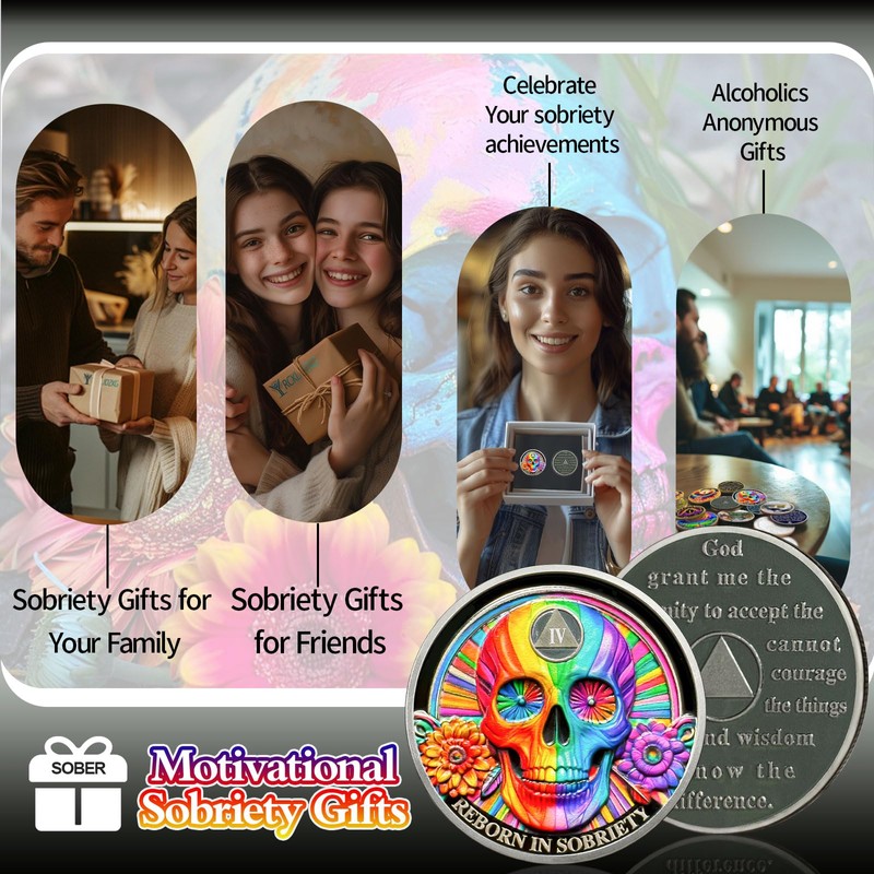 • REBORN IN SOBRIETY: The contrast between the skulls and rainbow colors of this colorful skull sobriety coin conveys a strong message of rebirth from the darkness of the past. It reminds us to bravely face our painful past and positively embrace a new life of sobriety. The Serenity Prayer provides us with a daily spiritual anchor to help us stay calm and wise. This aa sobriety coin can be used with AA coin keychains, AA Big Book and more