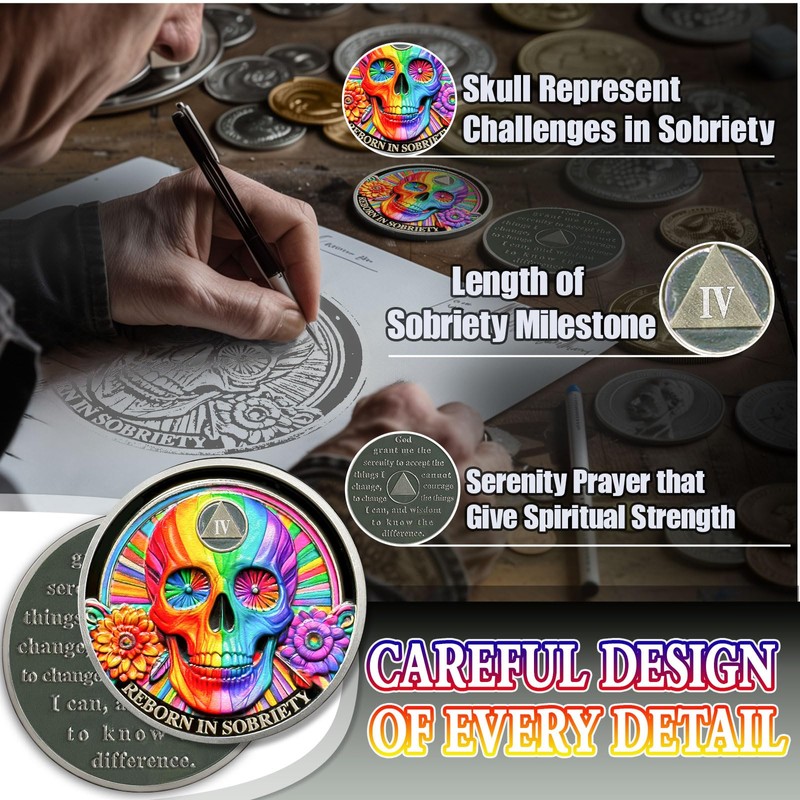 • Sobriety Skull: The AA coin features a colorful skull on the obverse, symbolizing death and a past life of addiction, as well as rebirth and a new beginning in sobriety. The beautiful flowers on either side of the skull symbolize the beauty and hope of life. The Roman numeral “Ⅳ” in the AA triangle above the AA chip represents four years of sobriety. “REBORN IN SOBRIETY” expresses the spiritual rebirth and recovery that we receive in sobriety