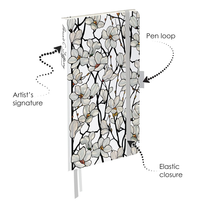 Each vegan leather journal is printed with a fine art masterpiece in vivid colors, with the artist’s signature on the spine. Complete with an elastic band to keep it securely closed in your bag, two silky ribbon bookmarks to keep your place, a loop to hold your pen, and an interior pocket for ticket stubs and photographs, this journal is ready to travel wherever you might take it. Each page is micro-perforated for easy tear-out, and thick enough to prevent ink from bleeding through to the other side. With 160 dot grid pages, this luxurious journal makes a perfect gift for students, writers, travelers, and art-lovers of any kind. The cover features Louis C. Tiffany's Magnolia, a masterwork in leaded glass. The artist designed this piece for his own home at Laurelton Hall, where its understated pearl and silver hues were the centerpiece of the grand library. This magnificent window is part of the permanent collection at the Charles Hosmer Morse Museum of American Art in Winter Park, Florida.