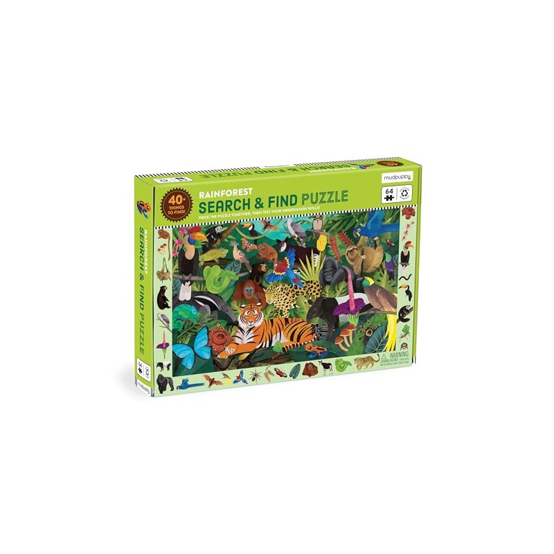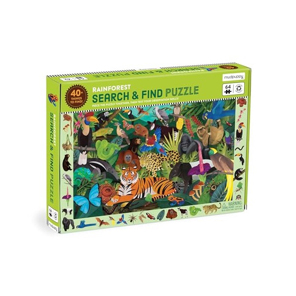 Mudpuppy's Rainforest Search & Find Puzzle is double the fun! First, children can piece together the 64 piece puzzle featuring diverse and colorful animals living in the rainforest. After putting the puzzle together, children can test their observation skills to find the 40+ animals, insects, and plant life in the border around the puzzle image. They are all there, can you find them? \- 64 piece puzzle \- 23 x 15.5" when complete \- Ages 4+ \- Puzzle greyboard contains 90% recycled paper. Packaging contains 70% recycled paper. Printed with nontoxic, soy-based inks.Processing Time