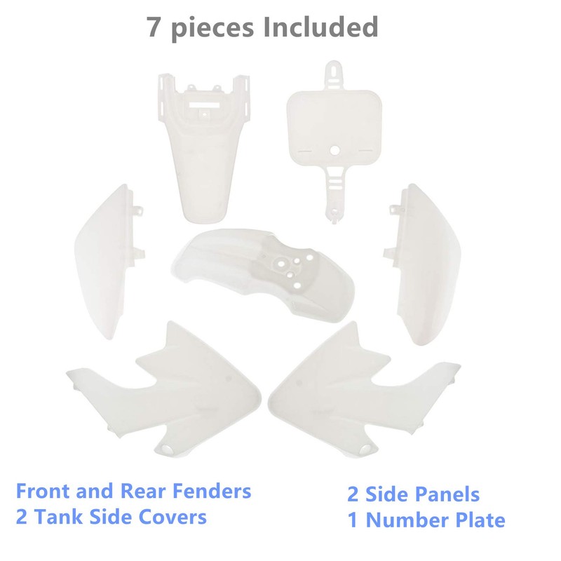 - 7 pieces Included: Front and Rear Fenders, 2 Tank Side Covers, 2 Side Panels, 1 Number Plate
