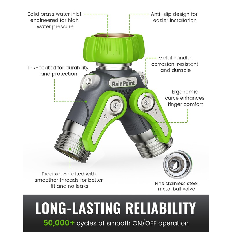 - RAINPOINT Garden Hose Splitter, 2 Way Heavy Duty Water Hose Y Spigot Splitter with Shutoff Valves, 100% Metal Body Outdoor Faucet Splitter, 1.9" Extra Long Metal Handle, 3/4" GHT Thread