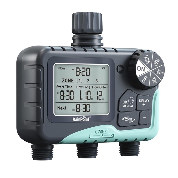 - 3 independent zones: The RAINPOINT irrigation computer has 3 independent outlets that irrigate 3 different areas via a tap. Each zone can be set with different start times, durations (1 minute to 4 hours) and frequencies (1-12 hours or from 1-7 days). Helps you easily control and manage watering for your garden, yard and lawn.