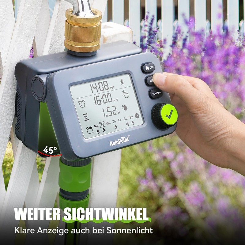 - Easy to use: simple and intuitive programming thanks to the twist and push principle; water now: If watering is to be started immediately, it can be activated manually; large display: the large LCD display shows all relevant facts. The angled display and 45% angle adjustable makes it easy to read the timer from different angles; 'Safe Stop' technology: valve closes automatically when the battery is empty.