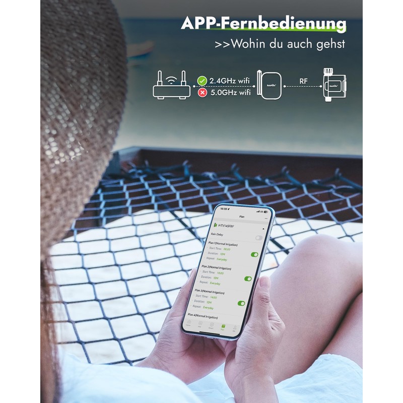 - More stable connection: Compared to conventional irrigation computer WiFi on the market, RAINPOINT has an improved antenna gateway (HWG023, 2.4 GHz), with a range of up to 150 m, and a more stable signal connection. A single gateway can control 39 watering timers (B0DS2J5JGM / B0DS2DX4PQ) and is ideal for large gardens.