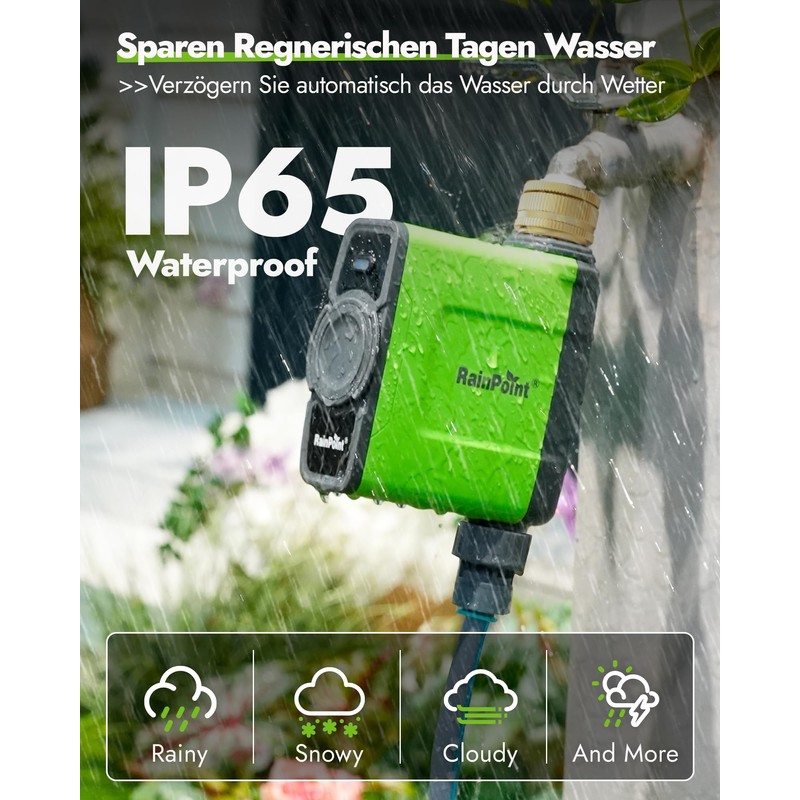 - Rain delay and manual watering: By creating intelligent scenes, the RAINPOINT WiFi watering timer automatically detects weather changes and adjusts the watering plans. You can also set a rain delay of 24/48/72 hours via the app to avoid overwatering. The app or timer supports manual watering at the touch of a button (default: 10 minutes) and does not interrupt the watering schedule.