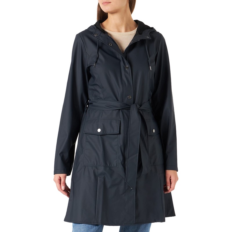 - RAINS SIGNATURE DESIGN: This waterproof female coat has a water column pressure of 4000mm. It's made of 100% polyester with Rains signature PU fabric (polyurethane) as coating and features ultrasonically welded seams. The finish is lightweight with a soft feel and elegant drape.