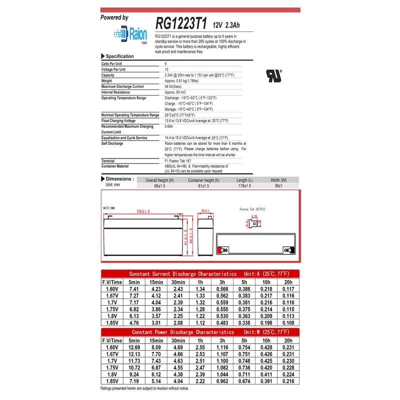 - Raion Power 12V 2.3Ah replacement batteries for Aspen Labs 1000 ATS Tourniquet are UL & CE certified (certification printed on batteries)