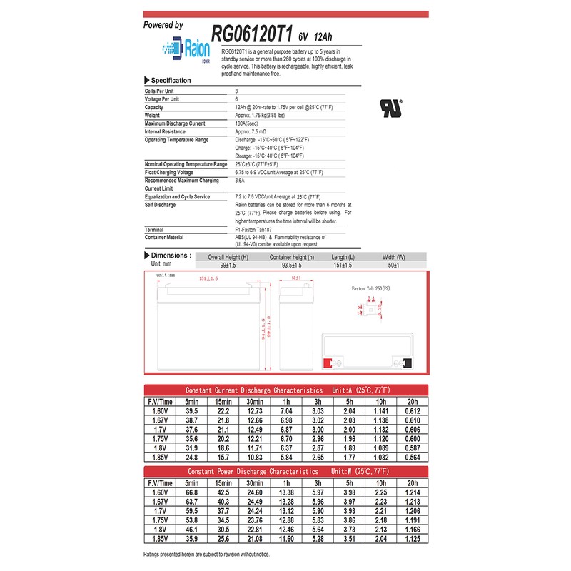 - Raion Power 6V 12Ah battery with T1 terminals is a direct replacement for Long Way LW-3FM12.