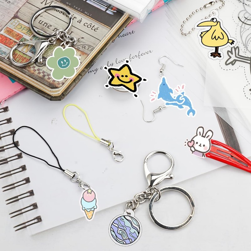 - Multiple key ring accessories: shrink film set key ring contains 12 colour markers, 1 hole punch, 1 manual (English language not guaranteed), 15 key rings, 5 key rings, 10 ear hooks, 10 round brooches, 10 teardrop barrettes, 20 ball chains, 20 mobile phone with carabiner clasp, 100 small iron rings, accessories for DIY different key rings crafts